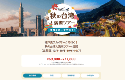 ツアー名:「神戸発スカイマークで行く!秋の台湾大満喫ツアー4日間」