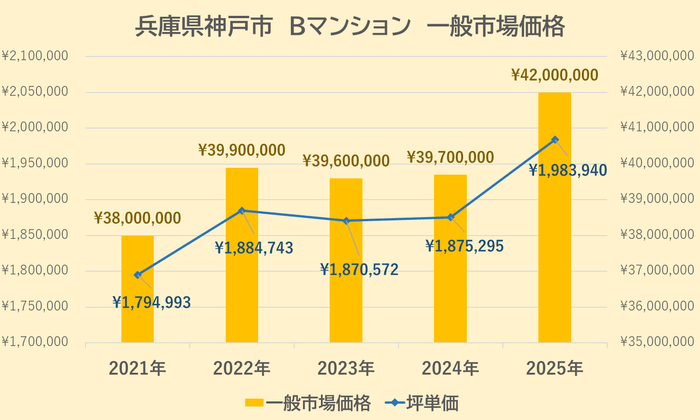 Bマンションの一般市場価格・坪単価の推移は上記【図4】の通りです。