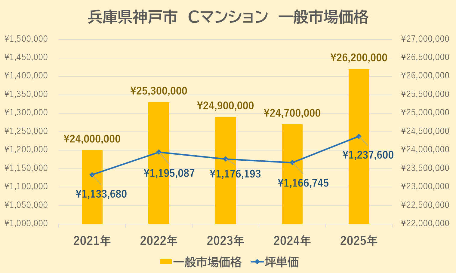 2021年は4,450 万円(坪単価:約210万円 (以下 @210万円) )でしたが、翌2022年は4,700万円(@222万円)と上昇、2023年は4,700万円(@222万円)と横ばい、2024年4,730万円(@223万円)には微増し、2025年は5,000万円(@236万円)と大きく上昇したことがわかります。