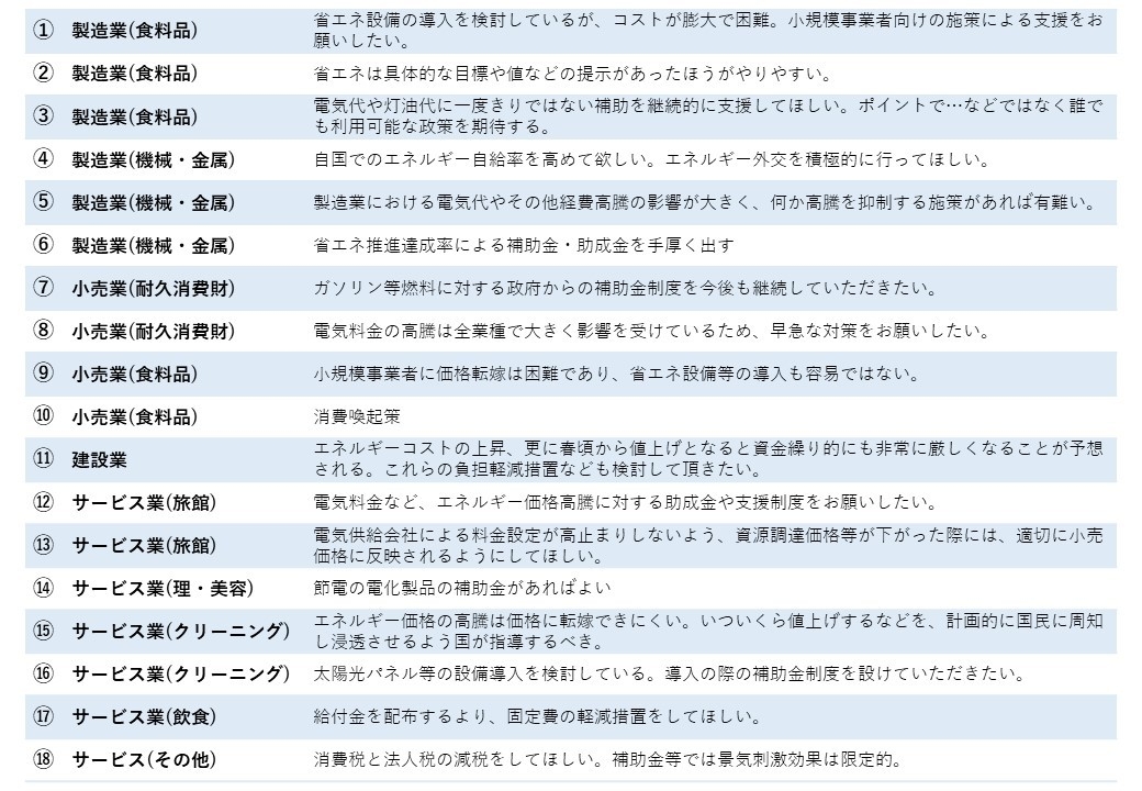●経費削減や価格転嫁等、自社でできる対策や対応はすでに実施済みであり、中小・小規模事業者からはこれ以上のエネルギー価格の高騰には対応できないとの声も聞こえ始めた。