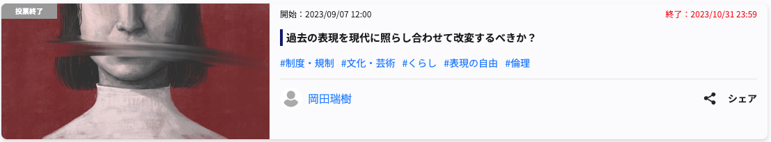 映画、テレビドラマ、漫画、小説、様々な表現媒体があり、その媒体によっても多少のグラデーションはあるものの、時代によって許されなくなってきた表現や言葉が多々存在します。これらを現代で発表するとき改変するべきか否か?みんなの意見を聞くべく、岡田氏がイシューを作りました。