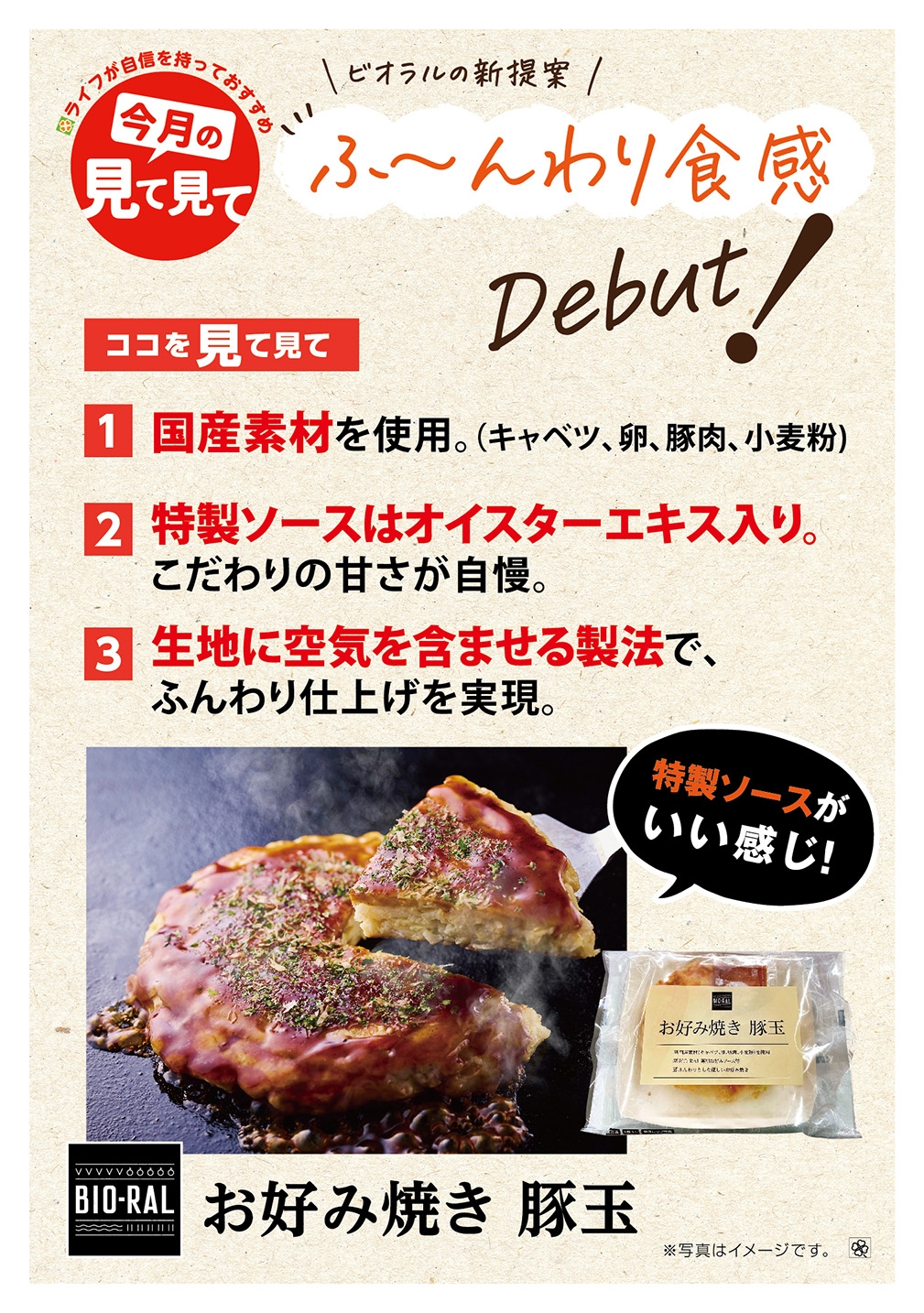 在宅時間の長期化や共働き世帯の増加により、今や生活に欠かせない「冷凍食品」。バリエーション豊富で保存にも便利なことから、「セカンド冷凍庫」を検討するご家庭も増える中、健康や自然志向にあわせたライフのプライベートブランド“BIO-RAL”より新商品が誕生いたしました。ライフが自信を持っておすすめする「今月の見て見て」近畿圏11月商品に選ばれた「BIO-RAL お好み焼き 豚玉」は、国産のキャベツ・卵・豚肉・小麦粉を使用した冷凍のお好み焼きです。コテを返さず生地に空気を含ませて製造しているので、冷凍商品でもお好み焼きのふんわりとした食感をお楽しみいただいけます。