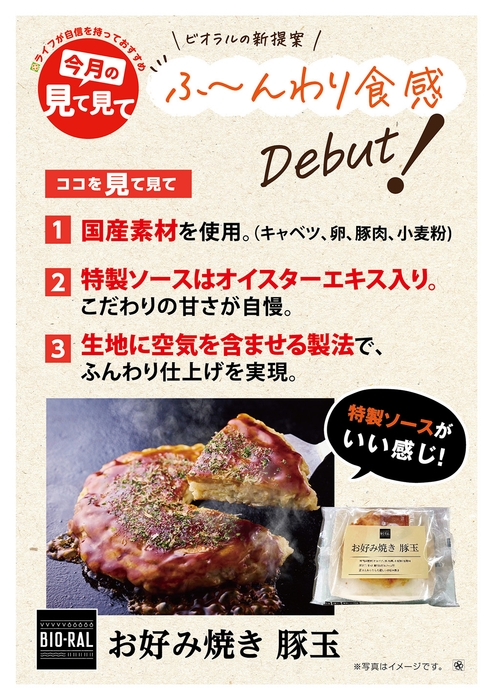 コロナ禍における健康志向・内食需要の高まりを受けて、ともに人気が高まっている「粉もの」料理と冷凍食品を組み合わせた商品を健康志向のプライベートブランド“BIO-RAL”から販売したいと思い、新商品を開発いたしました。関西で人気の「お好み焼き」を販売することで、お客様に“BIO-RAL”の商品を知っていただく機会にもなってほしいと思っています。国産素材のおいしさと、ふんわり食感をぜひお楽しみください!