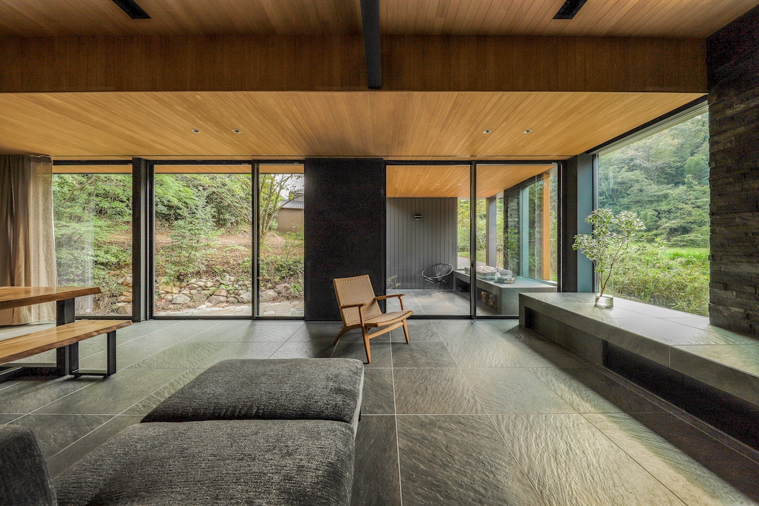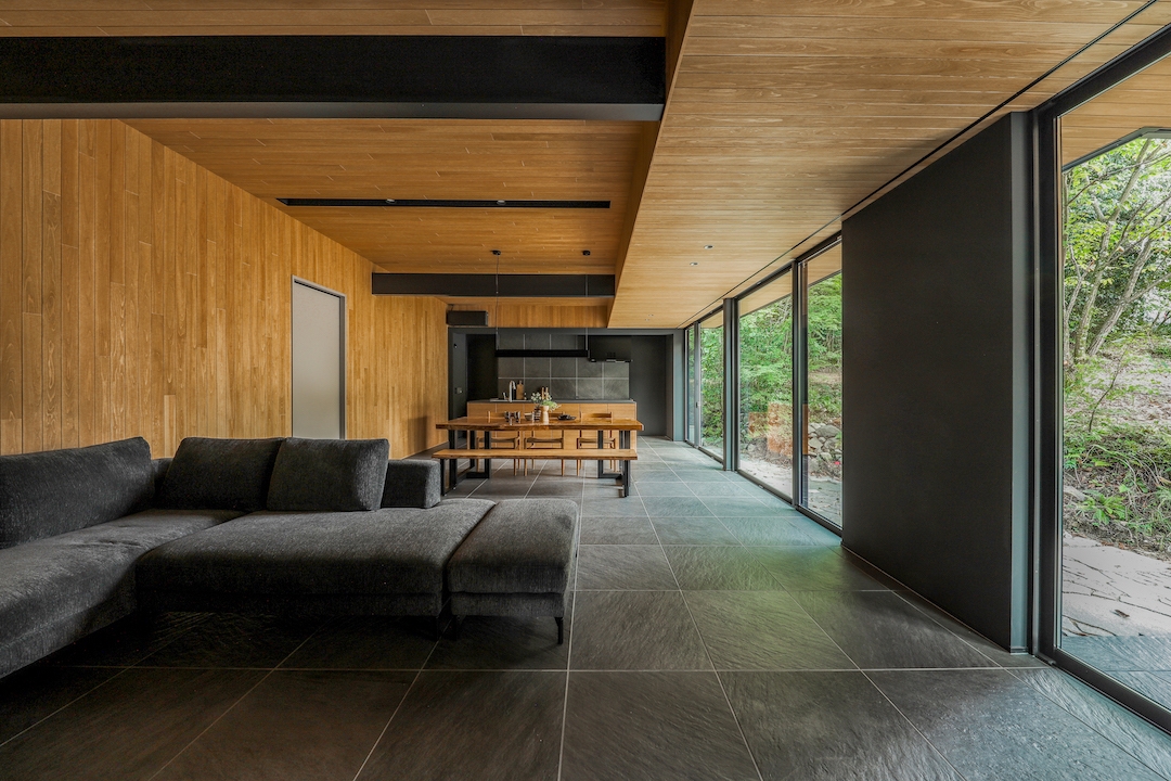 「雄大な自然の中にあるリゾートホテルのような住まいをつくりたい」とイメージされていたオーナー様へ自然を最大限感じ、活かすことのできどこにいても窓の外の緑を存分に感じることができます。また、ご友人を家に招くことが多いため、来客をもてなすオープンな場所としてのご提案も。LDKとアウトドアリビングを一体的に使ってのBBQパーティーや、敷地内で焚火・キャンプなど、心ゆくまでアウトドアな時間を愉しむ住まいが完成しました。