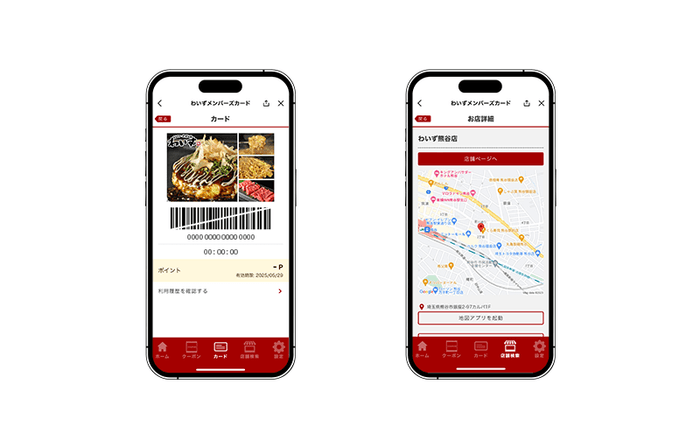 LINEミニアプリ『もんじゃ・お好み焼わいず』は、『LINE』のユーザーであればQRコードやURLを通じてアクセスし、新規にアプリをダウンロードすることなく『LINE』上で、簡単に会員登録できます。会員登録が完了すると画面上に会員証が発行され、当日のお会計のポイントを貯めてお帰りいただけます。会員証機能を搭載し、従来のポイントカードで貯めたポイントの移行にも対応しています。お会計金額の3%がポイントとして付与され、貯まったポイントは1ポイント=1円として次回以降利用できます。その他にも、会員限定のクーポンが配信され、キーワードやGPS等による店舗検索が行えるなど、便利な機能を搭載しています。