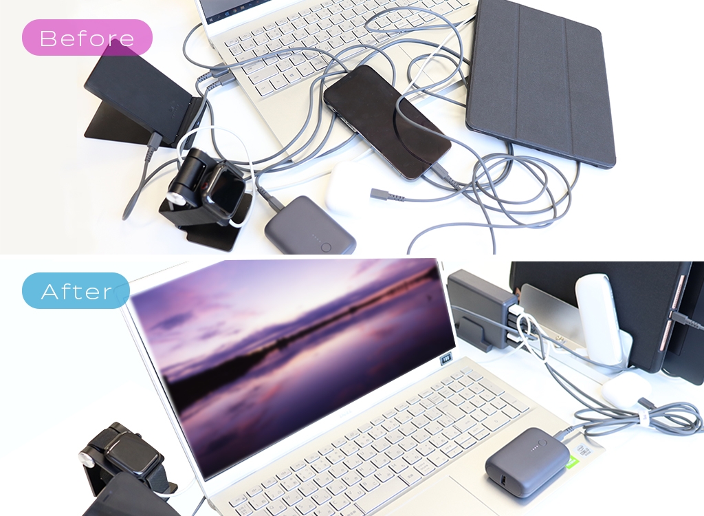 ・デスクの上でもすっきり配置できるコンパクトなボディ。複数の充電器を1つにまとめて、充電スペースをコンパクトにすることができます。