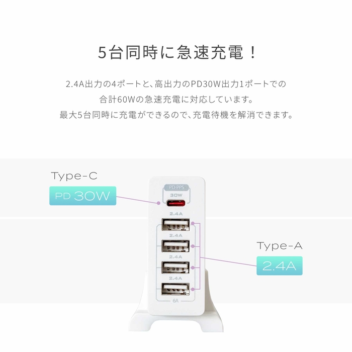 スマートフォンやタブレットなど、5つの機器を同時に充電することが出来ます。