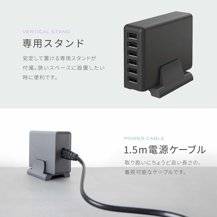 ・縦置きするのに便利なスタンドと、電源用ACケーブルが付属しています。デスクやベッド、リビング周辺などに、充電環境をスッキリと設置することが出来ます。電源ケーブルは取り外すことができるので、設置場所の自由度も広がります。