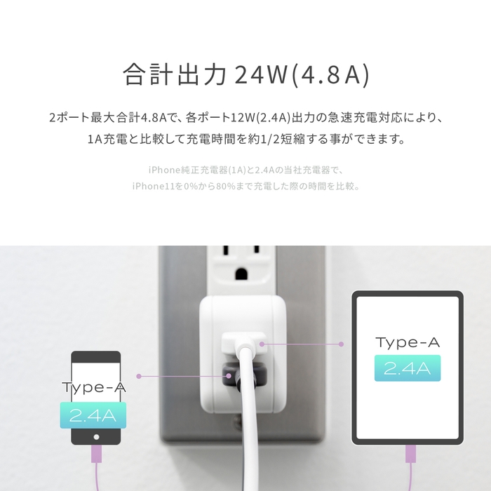 ・iPhone 11を80%充電するまでにかかる時間を比較すると、純正充電器5W(5V/1A)だと約150分かかるところが、2.4A充電器だと約70分で完了します。