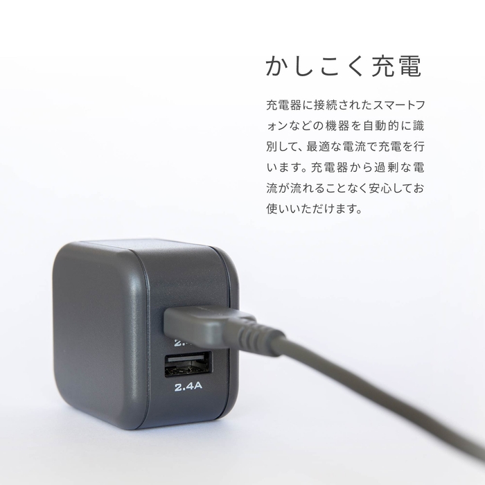 ・2台同時に急速充電が可能。2ポート最大合計24W(4.8A)出力対応で、スマートフォンやタブレット等の複数の機器を同時に充電することができます。