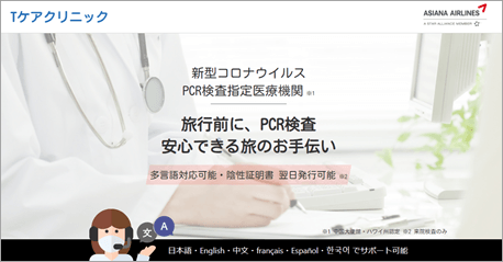 この度、当社はアシアナ航空Webサイト向けに当社グループ提携先であるTケアクリニック浜松町にて提供するPCR検査(自由診療)の専用ページを開設、海外渡航を予定されているお客様に対してPCR検査サービスの紹介を開始いたします。