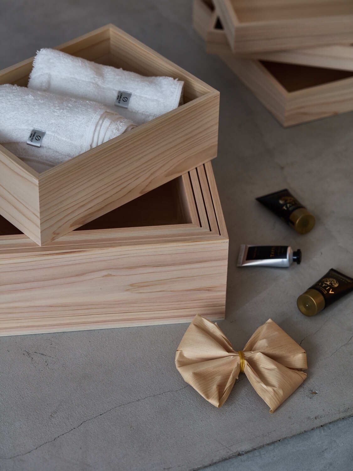 ひのき製品の制作過程で排出されるかんなくずを再利用し、香りをとじ込めた、バスリボン。