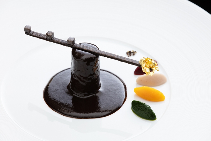 ジビエの女王とも言われる野兎を使った古典フランス料理です。野兎はジビエの中でも野獣臭が強く、パサつき、硬くなりやすい食材で、美味しく調理するには時間も技術も必要です。ユカワタンでは、野兎の肉をフォアグラやトリュフとともに2日間、とろけるほどやわらかなるまで煮込んだ後、1日おいて味を落ち着かせています。さらに、多くの人が野兎の臭みを感じずに味わえるよう、赤ワインやマデラ酒など数種の酒、ニンニクやエシャロットなどの香味野菜、ハーブ、スパイスなど、何種類もの香りを重ね合わせています。ソースにも赤ワインや香味野菜、ハーブ、スパイス、ダークチョコレートなど、いくつもの食材を、野兎をベースにした出汁に合わせました。長い時間煮込んだり、漉したりして、ソースの完成にも3日を要します。