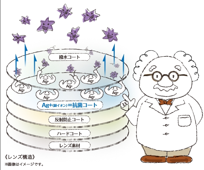 「抗菌機能付きコートレンズ」はレンズの撥水コートと反射防止コートの間にAg+(銀イオン)成分を含む抗菌コートを挟むことで、レンズ表面に抗菌性能を持たせることを実現しました。