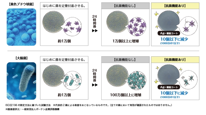 表面の細菌を増殖させないように加工されている製品を抗菌加工製品といいます。JIS(日本産業規格)では、加工されていない製品の表面と比較し、細菌の増殖割合が100分の1以下(抗菌活性値2以上)である場合、その製品に抗菌効果があると規定しています。