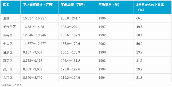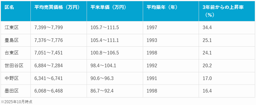 平均築年数が20年〜30年以上にもかかわらず、3年前と比較して20%超〜65%と高い上昇率で価格が推移している点も需要と人気の高さを裏付けています。