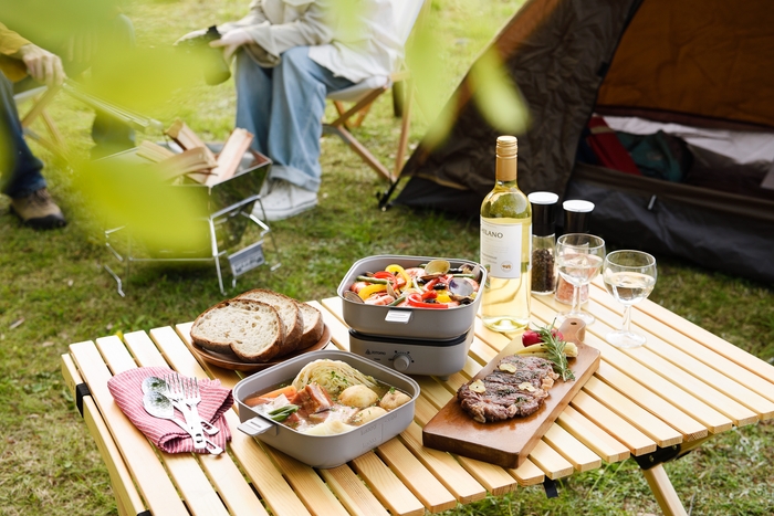 など、現状のアウトドア商品に様々な不満を抱える方に向けた、「家でもソトでも使える」収納や持ち運びを考えたコンパクトな電気調理器です。