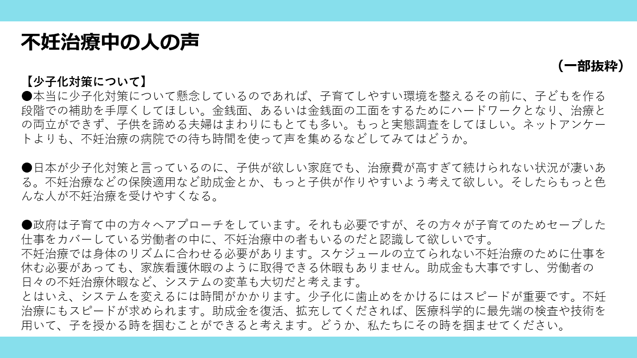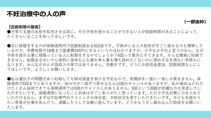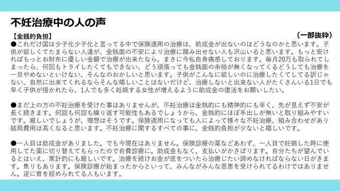 一般不妊治療の不妊検査や高度生殖医療の負担額を減らすための助成金を求める声が多く上がっています。