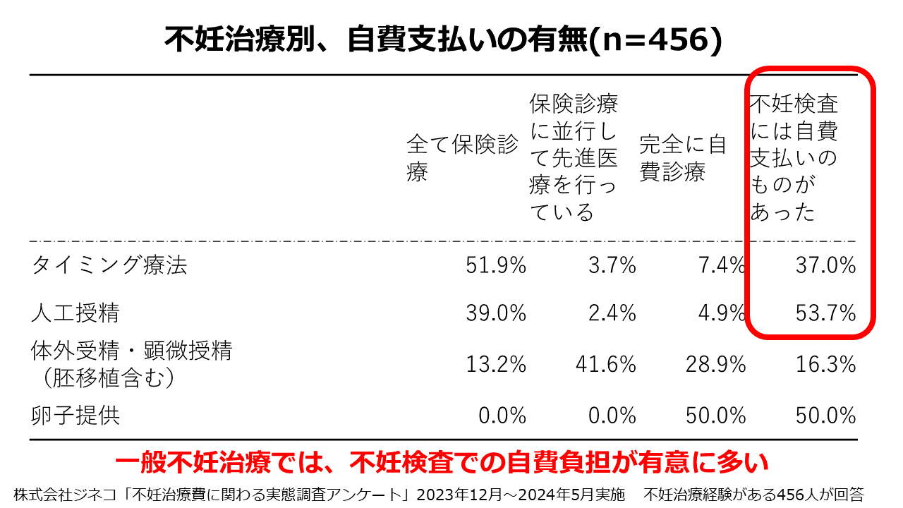 タイミング療法や人工授精などの一般的な不妊治療でも、検査段階で自費支払いが生じています。これは、保険適用内であっても追加費用が発生することが一般的であることを意味します。