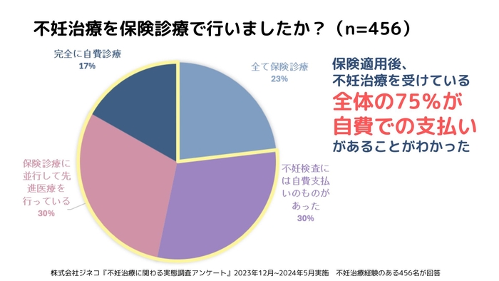 不妊治療が保険適用になったにもかかわらず、依然として75%の人々が自費での支払いをしています。このデータは、多くのカップルが保険診療だけではカバーしきれない治療費を負担している現状を示しています。