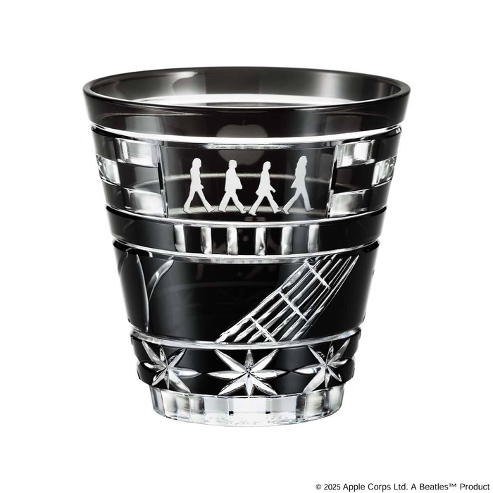 漆黒の色被せガラスに、アビイ・ロードの横断歩道を渡るメンバーのシルエットや楽器のモチーフ、英国のレンガの街並みをイメージした市松模様などが、伝統技法を用いて表現されています。