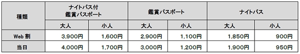 【料金】上記、ナイトパスまたはナイトパス付鑑賞パスポートのとおり