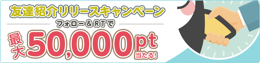 友達紹介機能リリースキャンペーンとして、期間限定「友達紹介ポイント倍増キャンペーン」、最大50,000ptが当たる「フォロー&RTキャンペーン」を同時開催いたします。