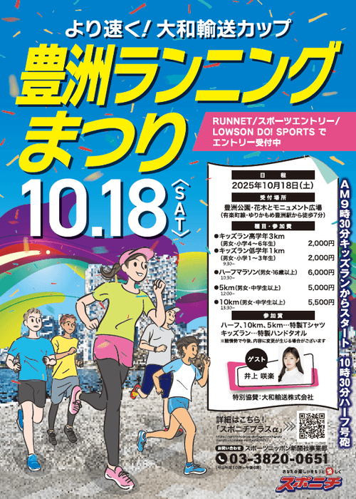 10月18日(土)開催「より速く!大和輸送カップ豊洲ランニングまつり」の参加者を募集しています。ゲストに人気タレント・井上咲楽を迎えます。賞品も豪華で、「叙々苑」の食事券総額40万円分、「東京豊洲 万葉倶楽部」の招待券、「チームラボプラネッツ TOKYO DMM.com」の招待券、ミニチュアミュージアム「スモールワールズ」の招待券などが用意されます。ハーフ・10㌔・5㌔・キッズランと種目も充実。団体割引を利用すれば、グループでの参加がお得になります。申し込みは9月30日まで。