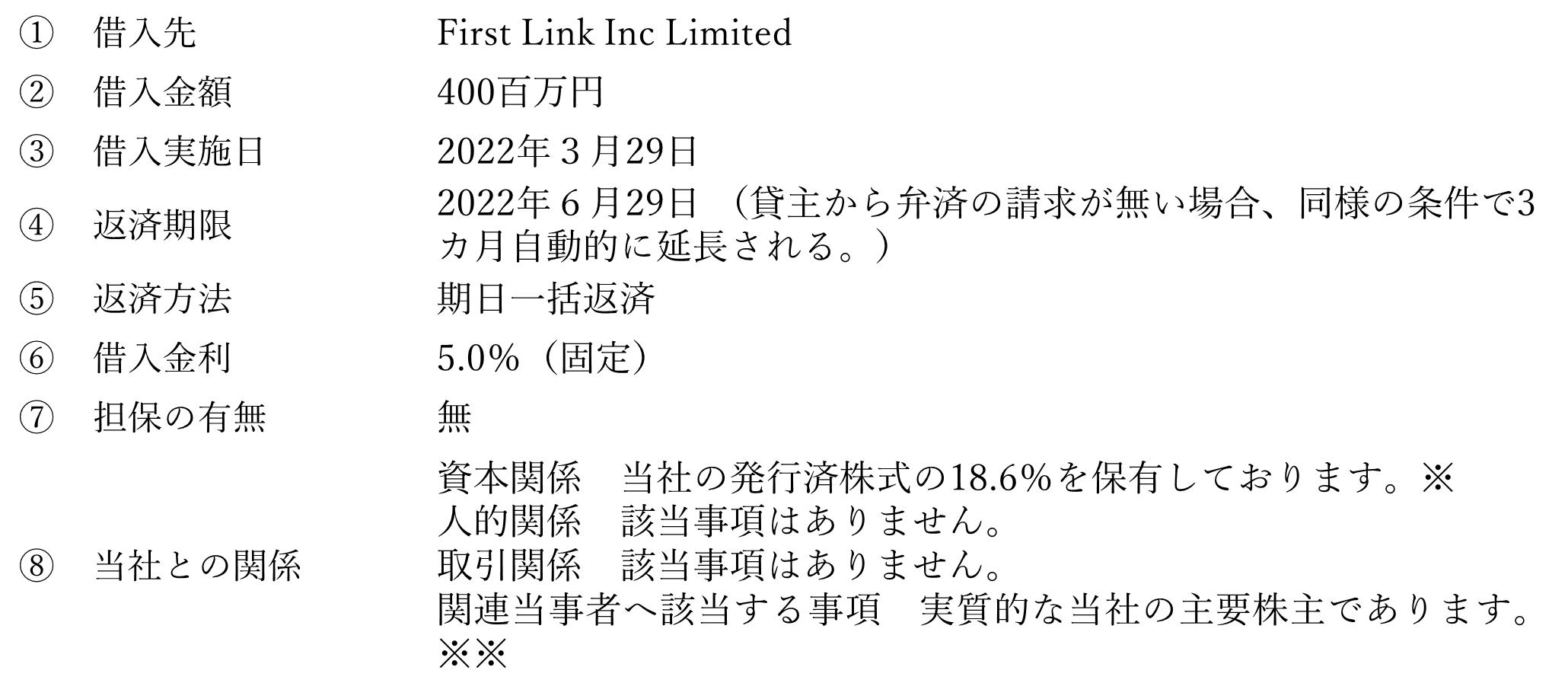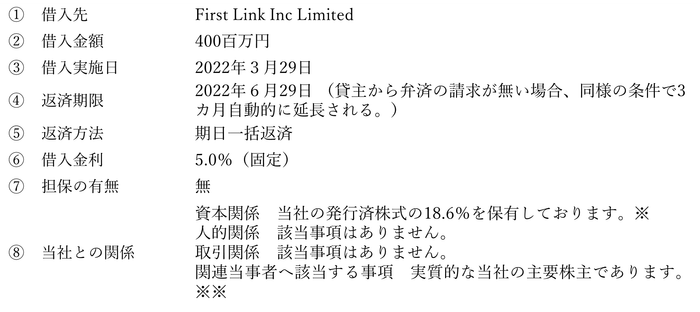 ※※当社では、関連当事者との取引に関しては、社内にてその相当性について審議・検証する体制を整備しております。当該取引の目的が、EV事業を進める上で、必要不可欠であり、当社グループの今後の業績回復を目指すにあたり、その必要性は高く、その相当性は妥当であると判断しております。また、本件借入について、市場金利等との乖離が大きくないことを確認し、借入に関する条件等を決定しております。