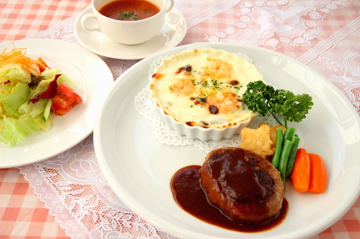 ホワイトソースたっぷりの小海老グラタンと、デミグラスソースがかかったジューシーなハンバーグは洋食屋さん定番人気メニューです。