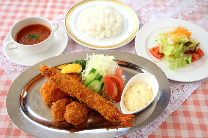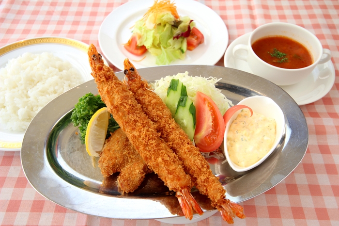 有頭海老を使用したサクサクエビフライと、肉の旨味をしっかり感じられるヒレカツフライのどちらも楽しめるワンプレートランチです。