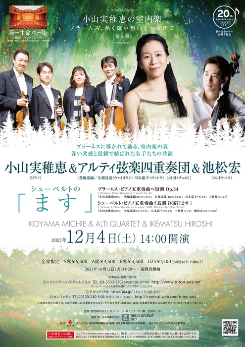 認定NPO法人トリトン・アーツ・ネットワーク(東京都中央区、理事長:長浜力雄)主催による第一生命ホール20周年記念『小山実稚恵&アルティ弦楽四重奏団&池松宏~シューベルトの「ます」』が2021年12月4日(土)に第一生命ホール(東京都中央区)にて上演されます。チケットはカンフェティ(運営:ロングランプランニング株式会社、東京都新宿区、代表取締役:榑松 ⼤剛)、主催者チケットデスクほかにて10⽉12⽇(火)より発売開始いたしました。