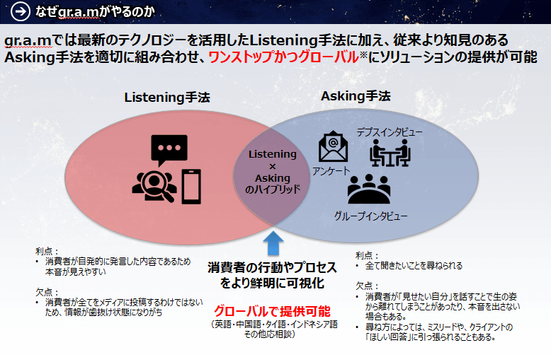 現在既に数多くのソーシャルリスニングサービスがある中、グローバルマーケティングリサーチで数多くの実績があるグラムだからこそ解決できる既存のソーシャルリスニングが抱える課題に対し、新たな価値を提供できると考え、サービスを開始いたしました。