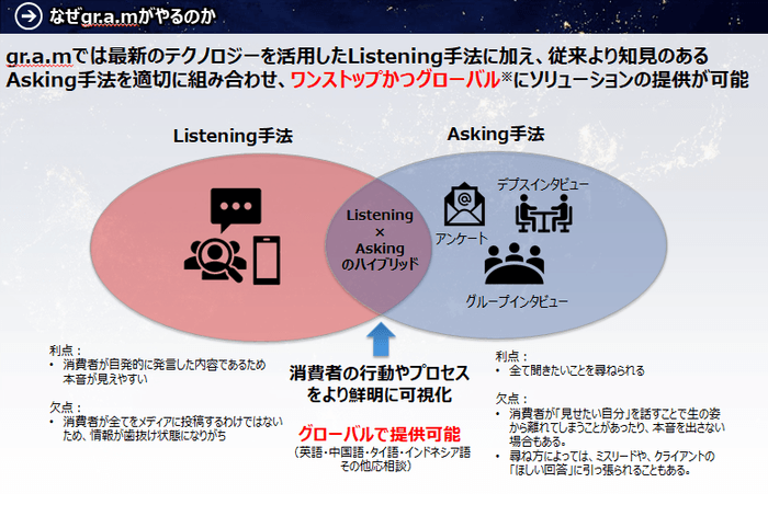 通常のソーシャルリスニング手法では消費者の本音に迫りやすいという利点がある反面、消費者がすべてをメディアに投稿するわけではないので、情報が歯抜けになりがちという欠点があります。この欠点に対してグローバルリサーチで長年培ったAsking型()の調査手法を組み合わせることで、消費者の行動や考えのプロセスをより鮮明に可視化させます。