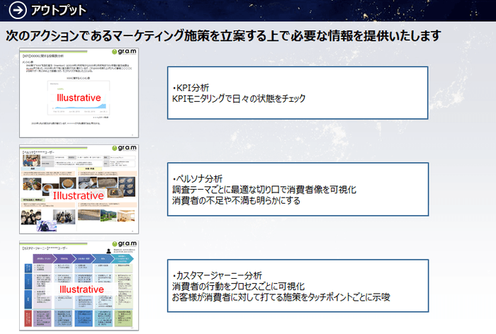 アウトプットとしては、次のアクションであるマーケティング施策を立案する上で必要となる情報を提供します。