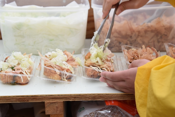 販売は午前10時から午後3時までの予定でしたが、今か今かと開店を待つ学生もいたほどで、講義を終えた学生たちや教職員らが次々と買い求め、特に昼休みには長い行列ができました。たこ焼きを味わった学生らは「ふわっふわで、とってもおいしい!」などと大喜びで、1パック6個入り(500円)を300食用意していましたが、午後2時には完売して営業を終えました。