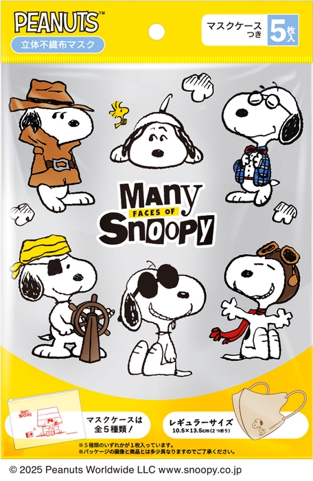 スヌーピーマスクが袋タイプになって新登場!「Many Faces」をテーマにしたデザインとなっており、様々な変装をこなすスヌーピーを見ることができます。マスク本体にはじっくり何かを考えているようなスヌーピーと反対側には可愛く走っているウッドストックがエンボスデザインで施されているデザインです。マスクや小物を入れるのにも便利なスライダー付ポーチが全5種でいずれかが入っています。どのスヌーピーが入っているかは開けてからのお楽しみ♪
