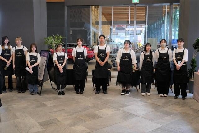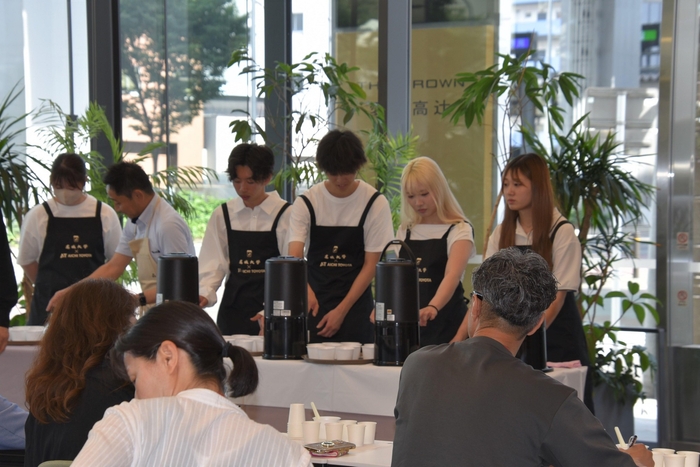 この日はゼミの2、3年生22人が参加しておそろいのエプロンを身に着け、午前と午後に分かれて接客を担当。コーヒーのコンセプトやブレンド割合、コップのデザインのポイントが書かれたチラシと「どうぞ味わってください」などとひと言を添え、来店した夫婦や家族連れ、ATグループの社員にゼミ生たちの思いが詰まったコーヒーを提供しました。味や香りをじっくり楽しんだ客らは「コクのある味わい」「後味がすっきりしていい」などと感想を話していました。