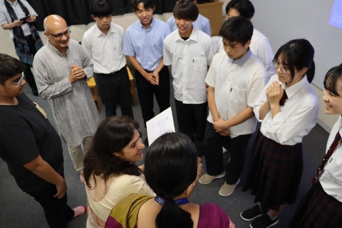附属高校では、IBコースの生徒と系列の英数学館高校IBクラスの生徒が順番にインド研修の模様を発表しました。附属高校2年、小澤柑奈さんは「インドで自分の強みを生かして社会貢献活動をする」ことを目的に行われたインド研修に参加し、街頭インタビューなどを経て、訪問前は「怖い、行きたくない」と思っていたのが、「全てが魅力的で、皆がフレンドリーで優しい」と変化した経緯を説明。帰国後、国際バカロレアの取り組みとして、両国の文化や魅力を広めていくことを目指し、SNSで発信するとともに交流会を計画していることを発表すると、代表団からは「素晴らしい!」の声とともに拍手が沸き上がりました。