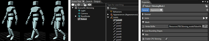 モデルデータに設定されたスキンメッシュアニメーションをインポートできるようになりました。骨格を曲げ伸ばしすることで皮膚が伸び縮みするような自然な表現の3Dアニメーションを実現できます。