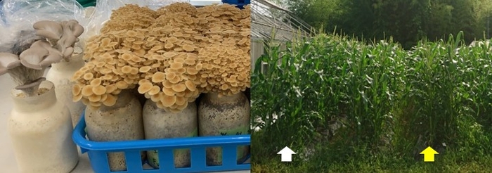 ●コーヒー抽出残渣を用いてきのこを栽培し、その廃菌床をトウモロコシ栽培の肥料に利用