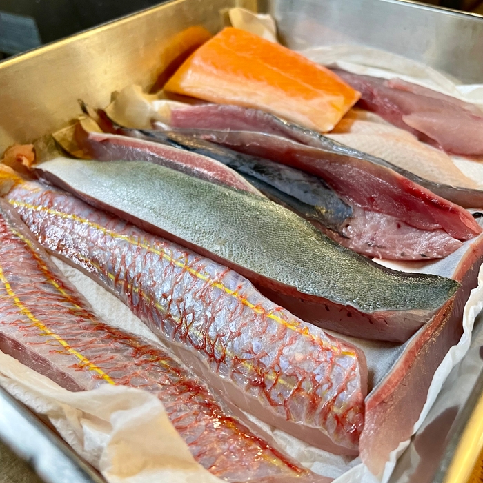 また、海鮮丼も絶品。毎回新鮮な魚介類を使用し、注文毎に丁寧に切り分けて提供します。今日の海鮮丼は、プリプリのイナダ、イトヨリダイ、カツオがたっぷりで、唐揚げ、小鉢、味噌汁が付いて大盛り無料で1200円という驚きの価格とボリュームです。