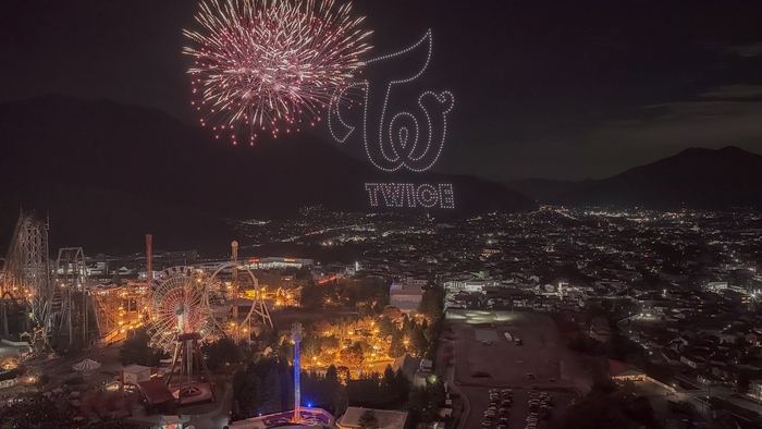 通常、安全上の理由からドローンと花火は距離をとって実施されますが、富士急ハイランドの広大な敷地と地形を利用することで、ドローンが描くTWICE LOVELYSのアート越しに、花火が重なって見えるという稀有な視覚体験を実現。会場からは次々に変化するTWICE LOVELYSや大型のクレーンゲームのアームに花火が重なるたび、大きなどよめきと拍手が沸き上がっていました。