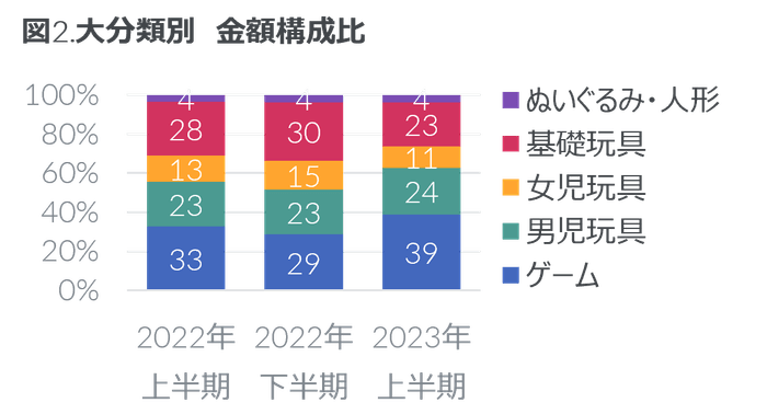 ・2023年上半期の玩具販売額は前年比13%増。2022年に引き続きトレーディングカードの販売が大きく伸びた大分類「ゲーム」が市場拡大をけん引。「男児玩具」「ぬいぐるみ・人形」も金額増加に貢献。