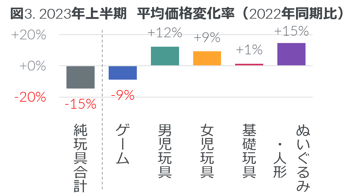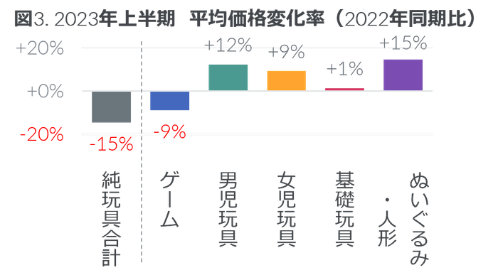 ・低単価商品構成比の高まりから、玩具全体の平均価格は前年に比べて15%低下。