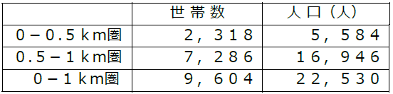 ・店舗から1km圏内は単身世帯比率が29.8%、2人世帯比率は32.2%と全体の6割が少人数世帯です。