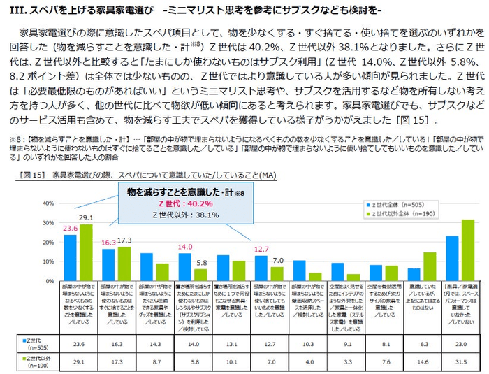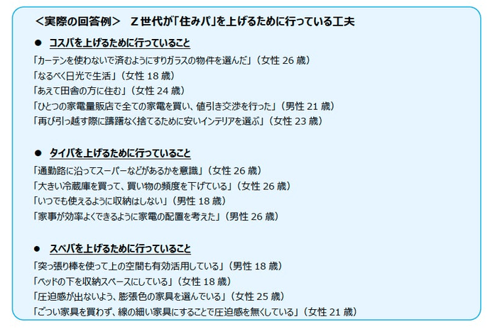 Z世代が「住みパ」を上げるために行っている工夫を自由回答で聞いてみると、コスパを上げるために、「なるべく日光で生活」(女性18歳)などの光熱費を抑える方法や、「ひとつの家電量販店で全ての家電を買い、値引き交渉を行った」(男性21歳)のような、まとめ買いでお得に購入をしている様子も見られました。