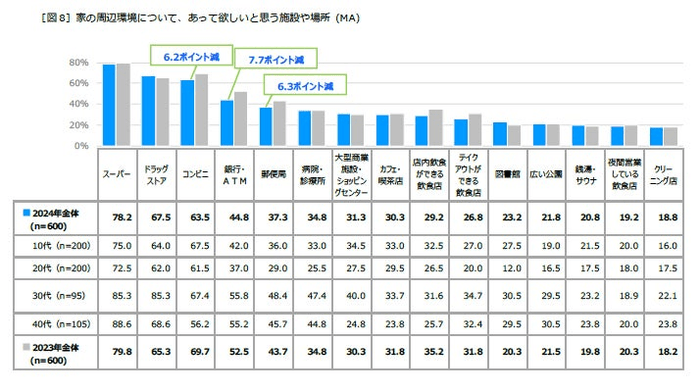 「コンビニ」は昨年度より6.2ポイント減少しており、外出機会が以前の水準に戻っている今、箇所数が多くアクセスしやすい「コンビニ」については、必ずしも「行きつけ」が家の近くになくても良いという人が増えているのかもしれません。「銀行・ATM」(44.8%)は7.7ポイント、「郵便局」(37.3%)も6.3ポイントそれぞれ減少しており、こちらもスーパーやコンビニ、ドラッグストア内でのATM機の設置が進んでいることや、キャッシュレスの浸透、荷物の発送サービスの多様化などが影響していることが考えられます[図8]。