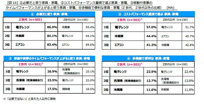 ②「コスパで選ぶ家具・家電」でもトップ3項目は同様となり、必要なものをしっかりとコスパを見極めて購入している様子がうかがえます。③「移動や家事のタイパが上がると思う家具・家電」④「多機能で便利な家具・家電」では、「電子レンジ」「洗濯機(乾燥機能あり)」「冷蔵庫」がトップ3となりました。Z世代以外では、タイパが上がる家電の1位は「洗濯機(乾燥機能あり)」で、洗濯における時短や手間の短縮がより支持されているようです。
