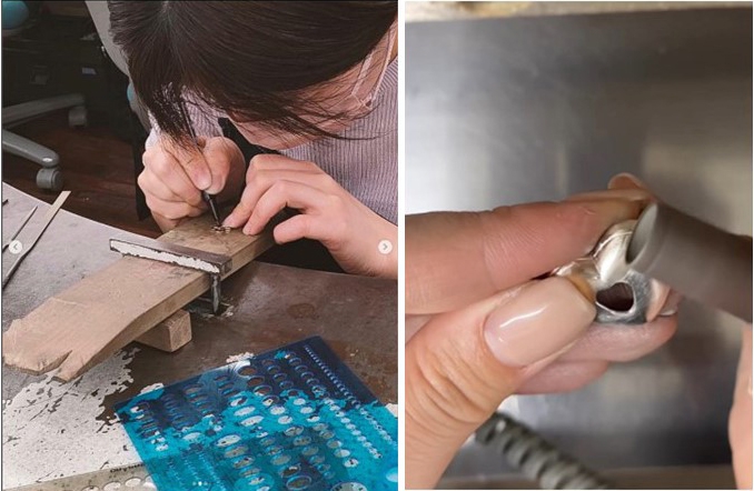 ほんの少しの角度の違いでも揺れ方や持続性にも影響が出てしまうため、デザインを考えると同時にいかに綺麗に見えるか、パーツをつける位置まで正確に計算する必要がありました。また、今回作るジュエリーは一つひとつが学生による手作業での制作だったため、石留めやパーツのロウ付けなどに苦労したと学生の皆さんは語っていました。